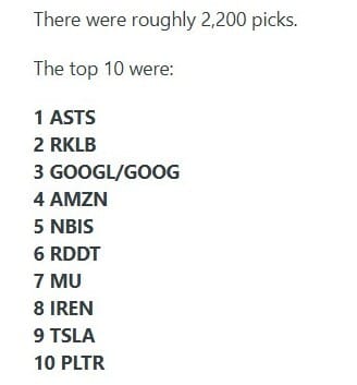 Last week they asked participants to post one stock they thought would do well in 2026. The 10 most popular ticker symbols are copied below.