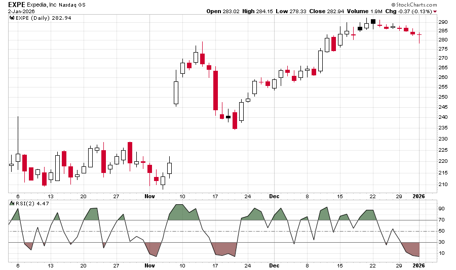 And, continuing the theme from this week’s Big Idea, the RSI(2) value is in single digits. The interpretation for individual stocks is the same as for an index: a short-term dip is likely to be reversed.