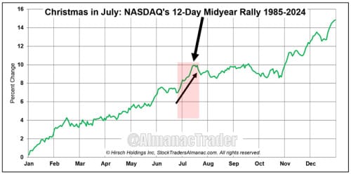 Hirsch points out a strong seasonal pattern covering the last three business days of June and first nine of July. This year that covers the period from June 26 to July 14.