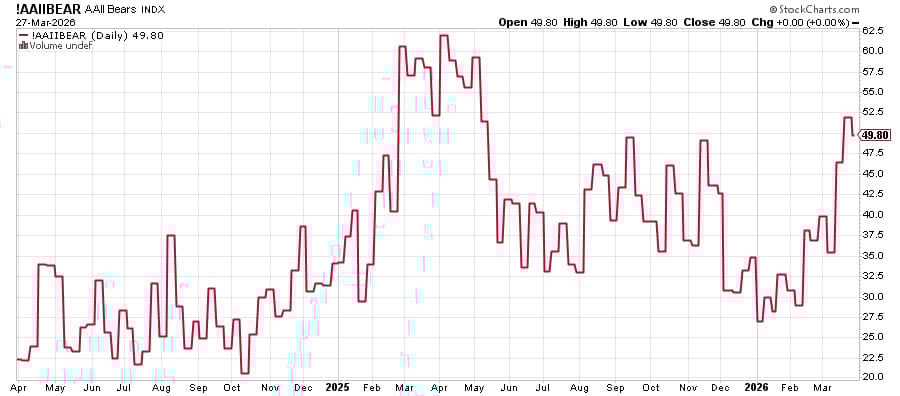 The chart above plots the percentage of respondents who are bearish from the weekly AAII sentiment survey. There are more people than usual in the bear camp, but not a panic-level amount.