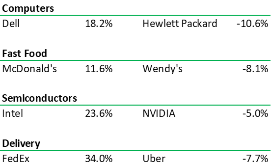 Of course, nothing is ever as simple as that. Even among similar companies with similar businesses you can still end up with bigly different results. Take a look at the YTD returns for a few pairs of well-known stocks.