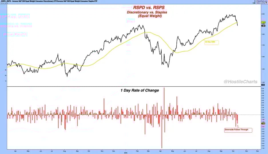 He is referring to the brief market scare at the beginning of August, we think. The ratio of Discretionary to Staples did not fall as much at the time and did not break through its own moving average as it did on Friday.