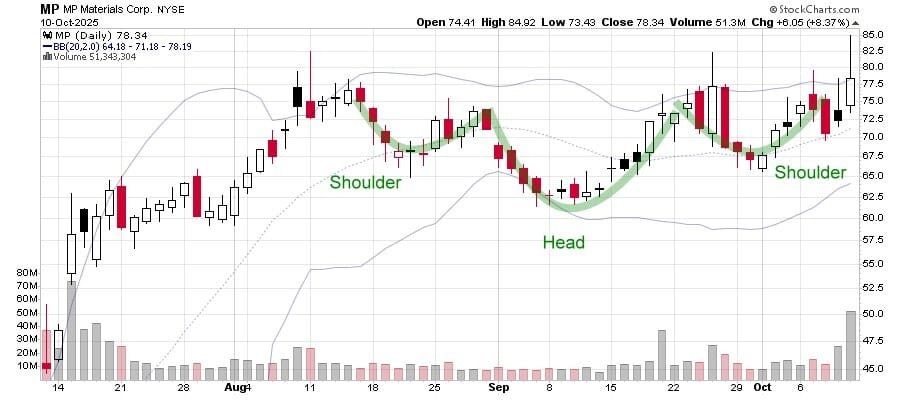 MP (MP Materials): The company mines “rare earth” minerals, a hot topic these days. You might think the company’s shares would be caught up in a speculative frenzy. In reality, MP is only now finishing a technically solid base.