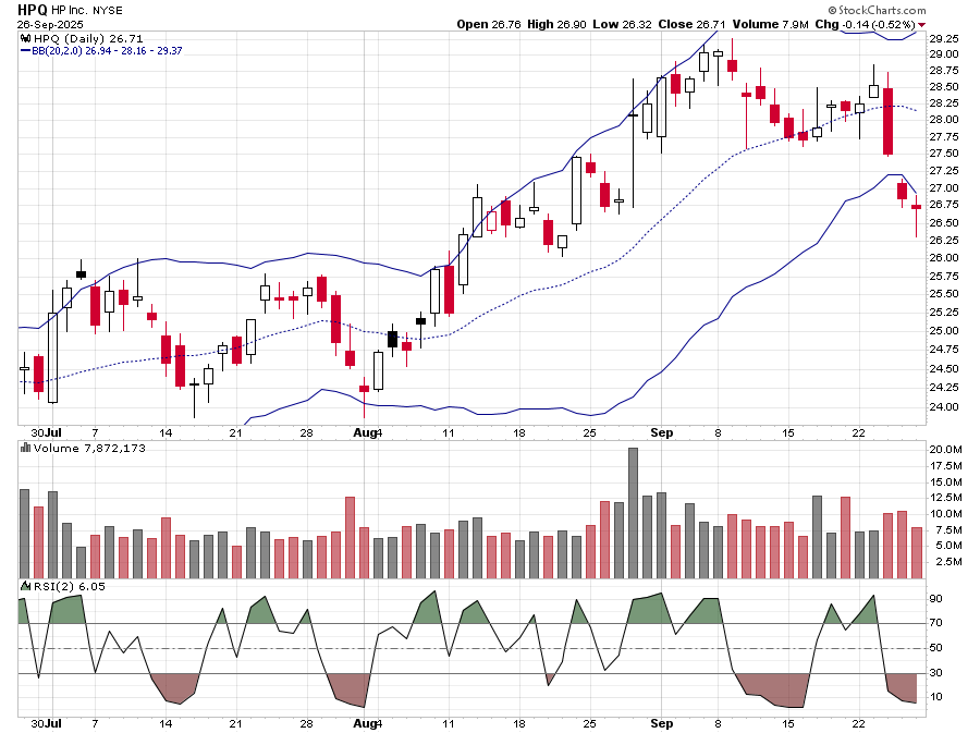 What we like about the chart is that HPQ spent the last two days fully outside its Bollinger bands. Often times this leads to a reversal or, worst case, a sideways type of move. On top of that, Friday’s trading generated a hammer candle on the chart which is a well-known bullish setup.