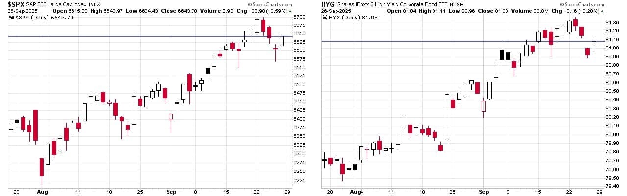 Below we have charts of the S&P 500 and HYG, the iShares High Yield Corporate Bond ETF. There is also a horizontal plotted at the current value for each, to help compare the two charts.