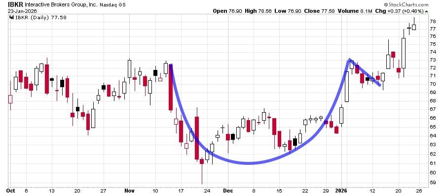 The two end points of the cup came at an area of strong resistance at $73, going back to earlier in the fall. Why that specific price mattered to IBKR traders is not immediately clear. Now, that price should provide a solid floor in the event of a downturn in the market.