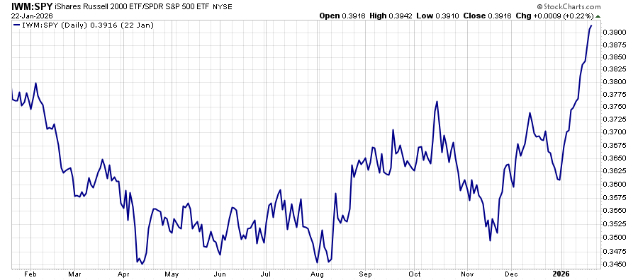 In the chart below, we take a ratio of the Russell 2000 index to the S&P 500. When the line is going up, the small stocks are doing better than their larger counterparts.